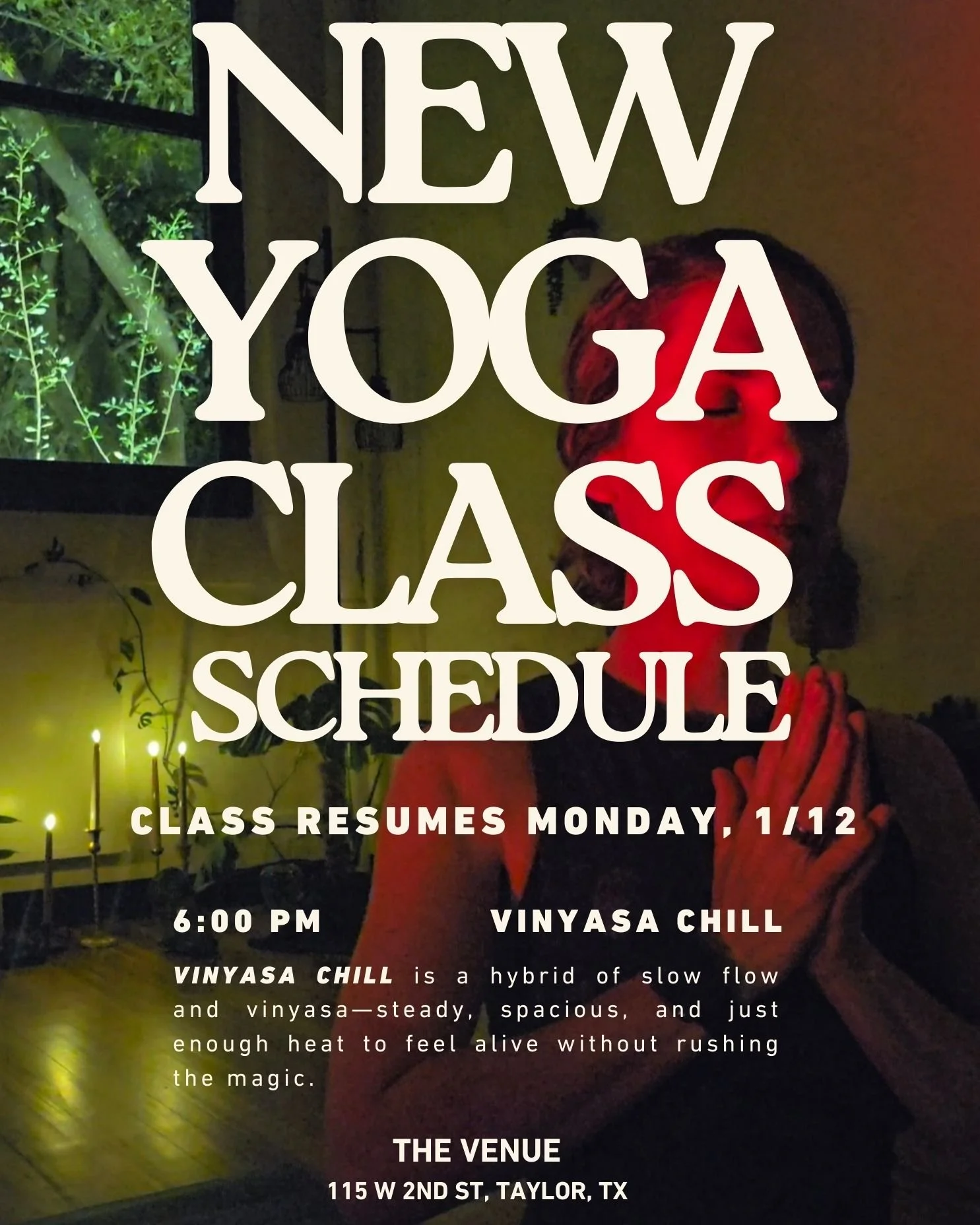 As we head into the new year, I’m streamlining the Monday offerings. Instead of teaching Slow Flow and Vinyasa as separate classes, I’ll be blending the best of both into one unified class: